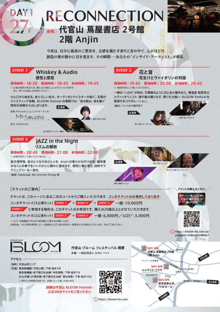 今年3月27〜29日の3日間、代官山を舞台に開催される「DAIKANYAMA BLOOM Festival 2026」。 実はこの音楽祭、Arcopizz音楽教室のソリストコースを担当いただく滝千春さんが主催しており、岩崎工房も運営やワークショップ講師として参加しています。