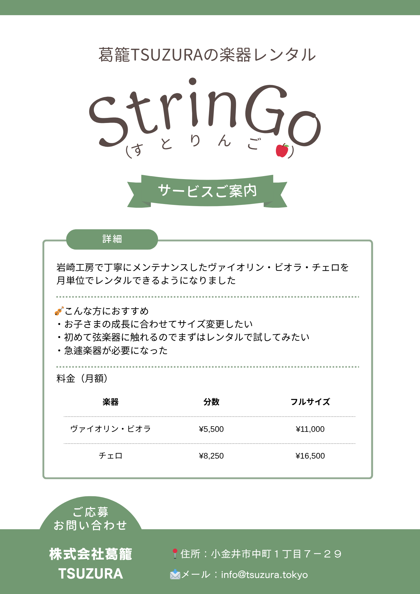 レッスンの前後に楽器の調子をチェックしたり、弓の毛替えを相談したり……。これは工房が運営する教室ならではのメリットです。岩崎工房が自信を持ってお勧めできる楽器を集めた「StrinGo🍎レンタル楽器」もご利用いいただけます。
